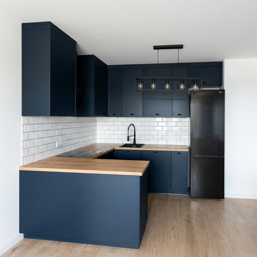 Granatowa kuchnia z dębowym blatem – loftowa realizacja w Częstochowie