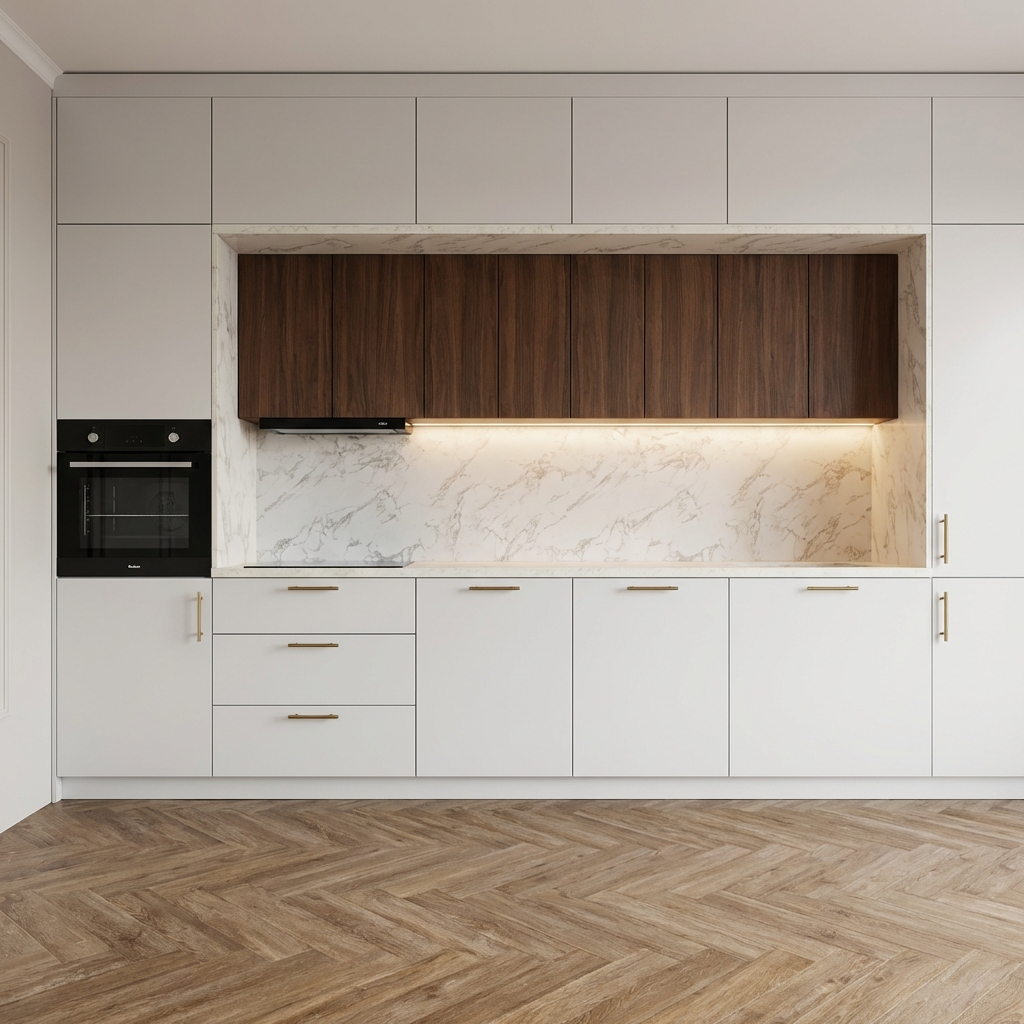 Harmonia bieli, drewna i marmuru – luksusowa kuchnia na wymiar