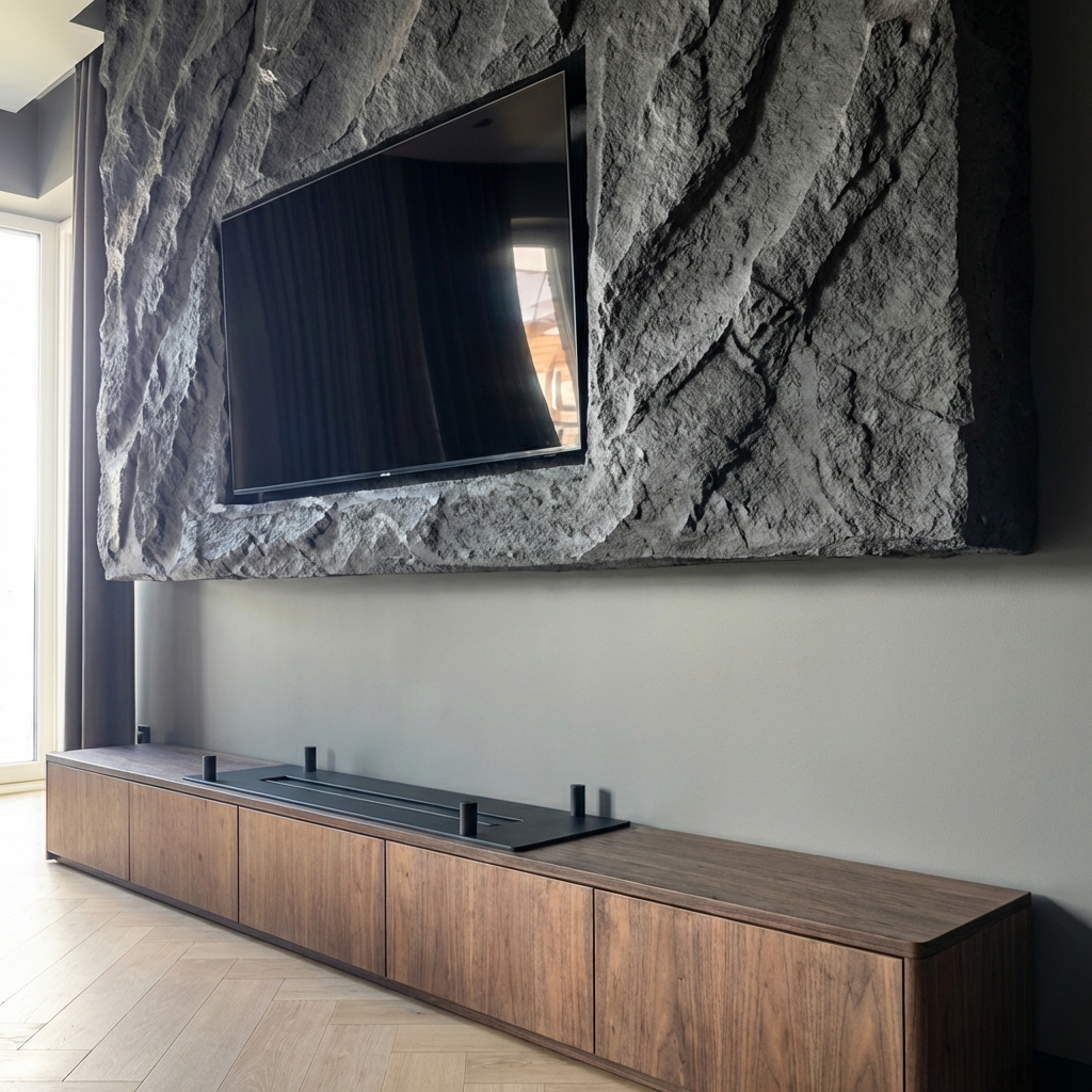 - Designerska strefa TV: Centralnym punktem salonu stała się podwieszana szafka RTV w głębokim, orzechowym dekorze z pionowym usłojeniem. Idealnie komponuje się ona z monumentalną, strukturalną ścianą imitującą naturalną skałę, tworząc luksusowy, niemal kinowy klimat.